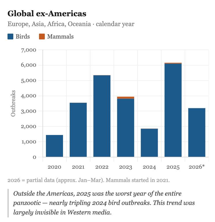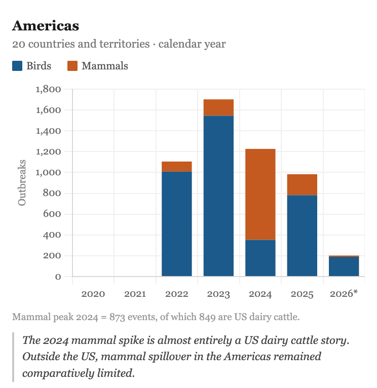Data from the FAO, the WHO and national authorities that have maintained epidemiological surveillance show that 2025 was the worst year of the entire clade 2.3.4.4b era, and the trend for 2026 continues to rise (FAO H5 HPAI Dashboard).The situation has continued to escalate through 2026. In February, H5N1 was confirmed for the first time in northern elephant seals in California,  the first detection in that species in North America, and a reminder that the virus continues expanding into new mammalian hosts.  In March 2026, EFSA documented the first possible spillover to dairy cattle in the European Union (EFSA, March 2026). Note: 2026 data in the charts below is incomplete as it covers only the first three months of the year, which explains the apparent decline.