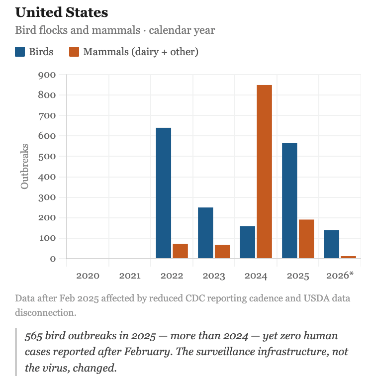 Avian influenza is not COVID. There is no sustained human-to-human transmission yet. But now is precisely when vigilance must be maintained, not after the virus mutates into a form transmissible between humans, triggering a pandemic. Public health surveillance systems serve to detect these changes before they become emergencies, enabling us to prepare for both prevention and response. Dismantling and censoring these surveillance systems during an active outbreak, and influence the world’s media agenda along with that decision, could have potentially catastrophic consequences. In the United States, no human case has been reported since February 2025.