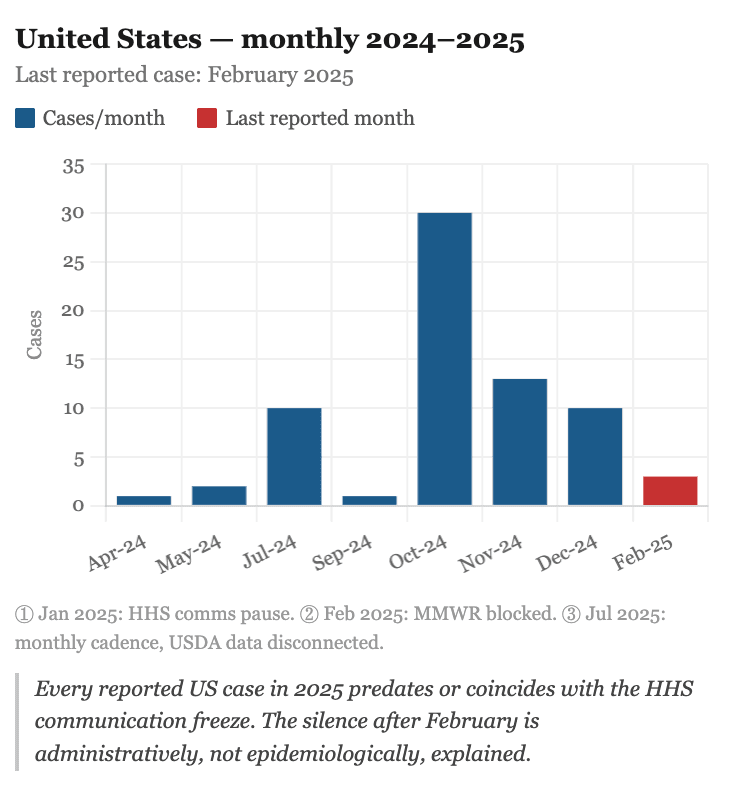 The new US administration ordered a pause on all external communications from the CDC (CNN, January 2025). The Morbidity and Mortality Weekly Report (MMWR), published without interruption since 1952, missed two consecutive issues for the first time in its history due to the HHS communications freeze, and resumed publishing with politically directed content. Studies on transmission of the virus to domestic cats owned by dairy workers were blocked (CBS News, February 2025). In July, the CDC reduced its H5N1 reporting from weekly to monthly and stopped publishing USDA animal data from its website (CDC, July 2025). The US also withdrew from the WHO in January 2025 (effective from 2026), withdrawing its entire contribution, 18% of WHO’s total funding. ceased negotiations on the WHO Pandemic Agreement, and rejected the amended International Health Regulations (White House, January 2025), the legal framework governing global cooperation on disease control across borders. As US H5N1 reporting went silent, international coverage declined, yet the epidemiological situation continued to escalate.